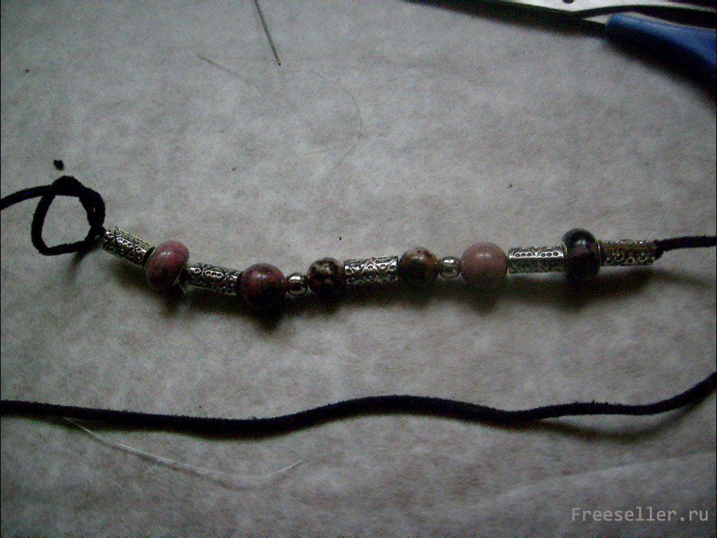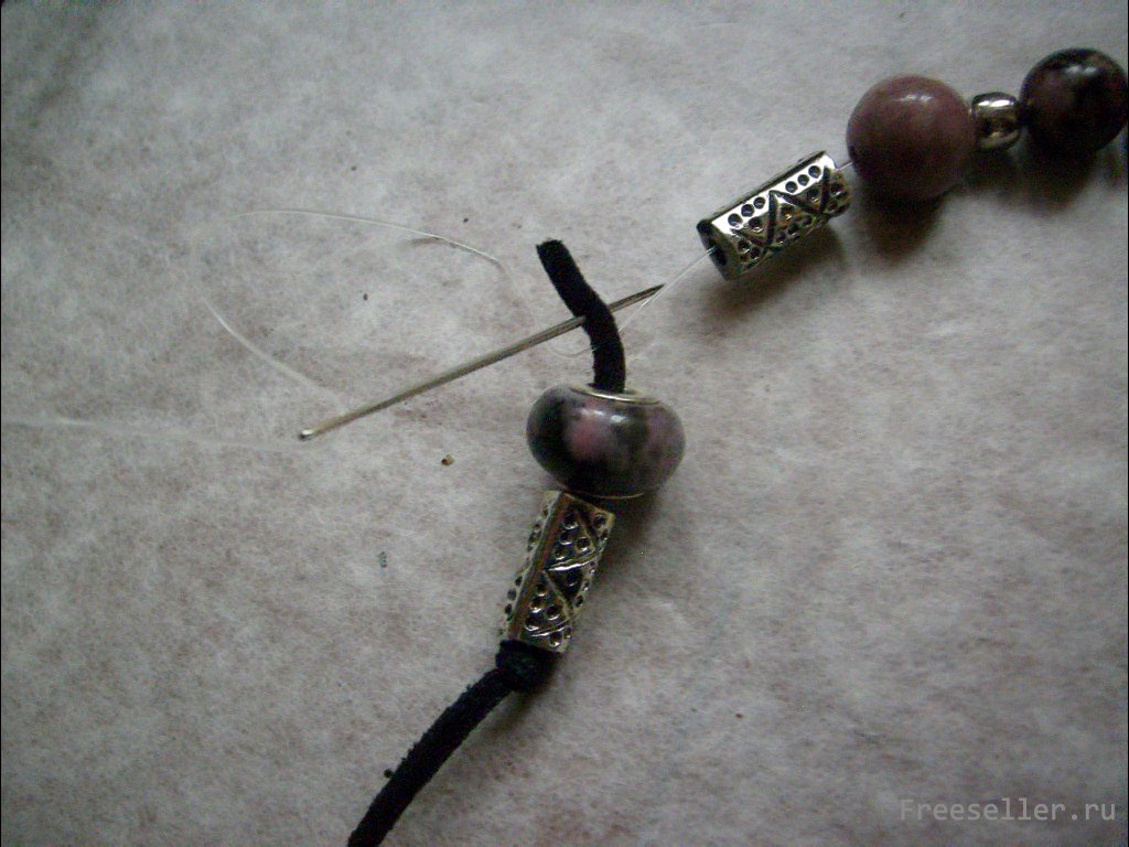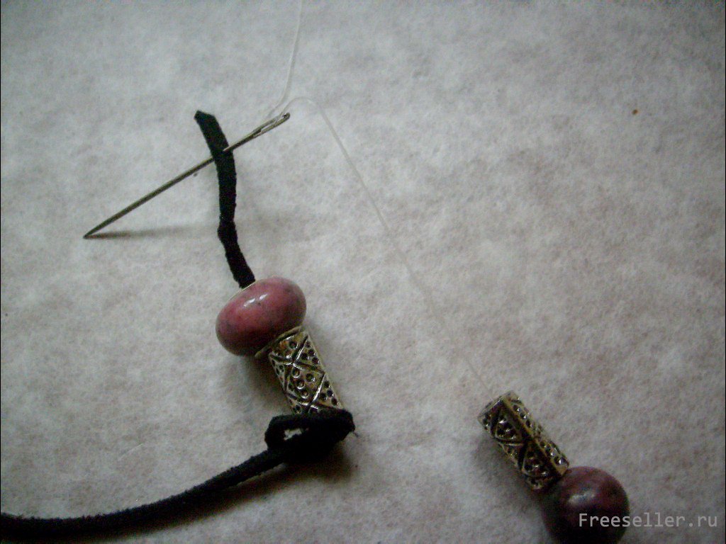 Оставляем на одном конце шнура запас только для нанизывания бусин с широкими отверстиями и скрепления шнура с леской. Завязываем на этом расстоянии тугой узел. На другом конце шнура узел завязываем свободно, не затягиваем. Нанизываем бусины.