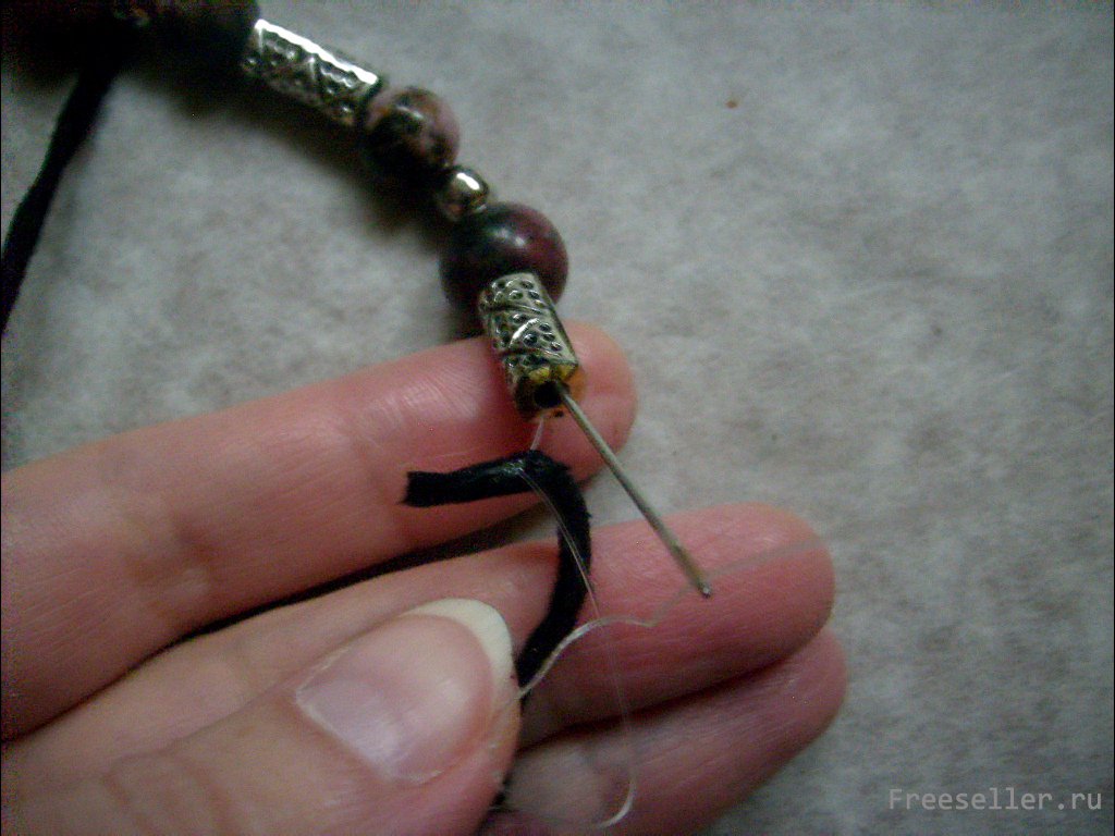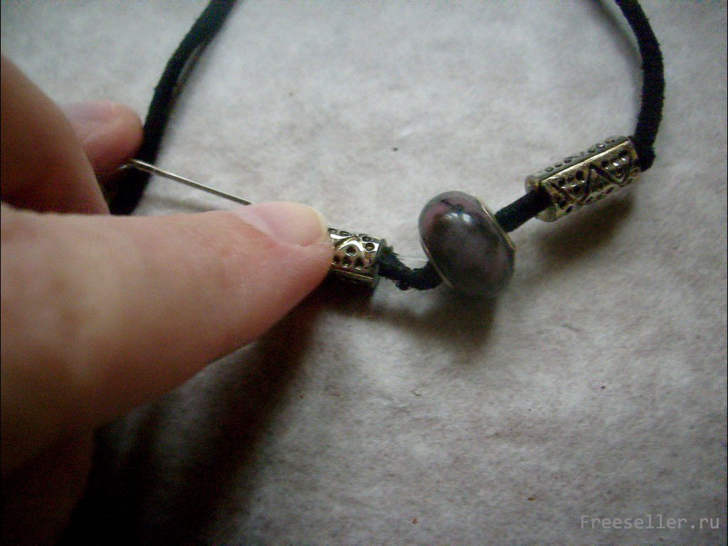 Вдеваем конец лески, на которую нанизана наша середина, в иголку. Прошиваем ей один конец шнура. Закрепляем леску.