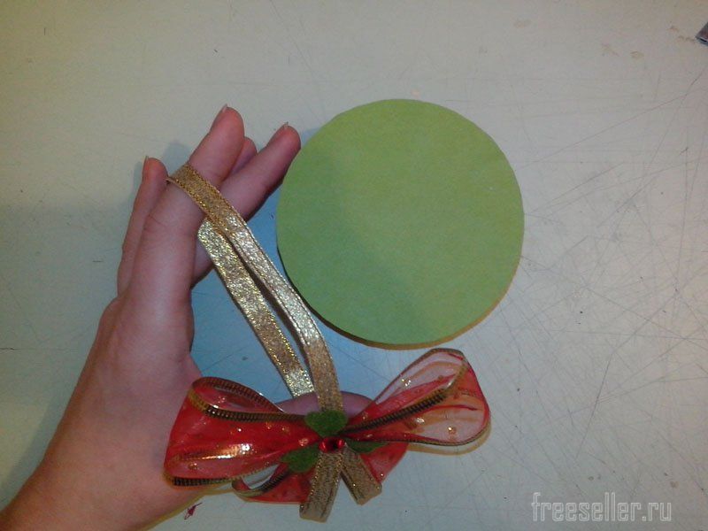 Из ленточек сделала бант на верхнюю крышку, и линию по контуру.