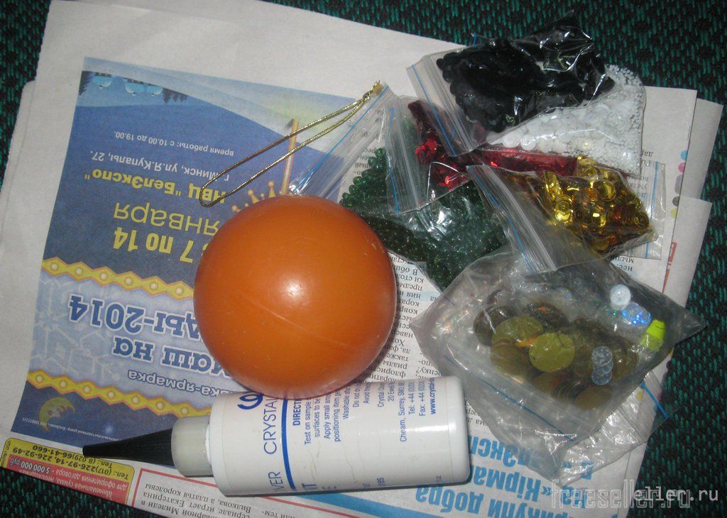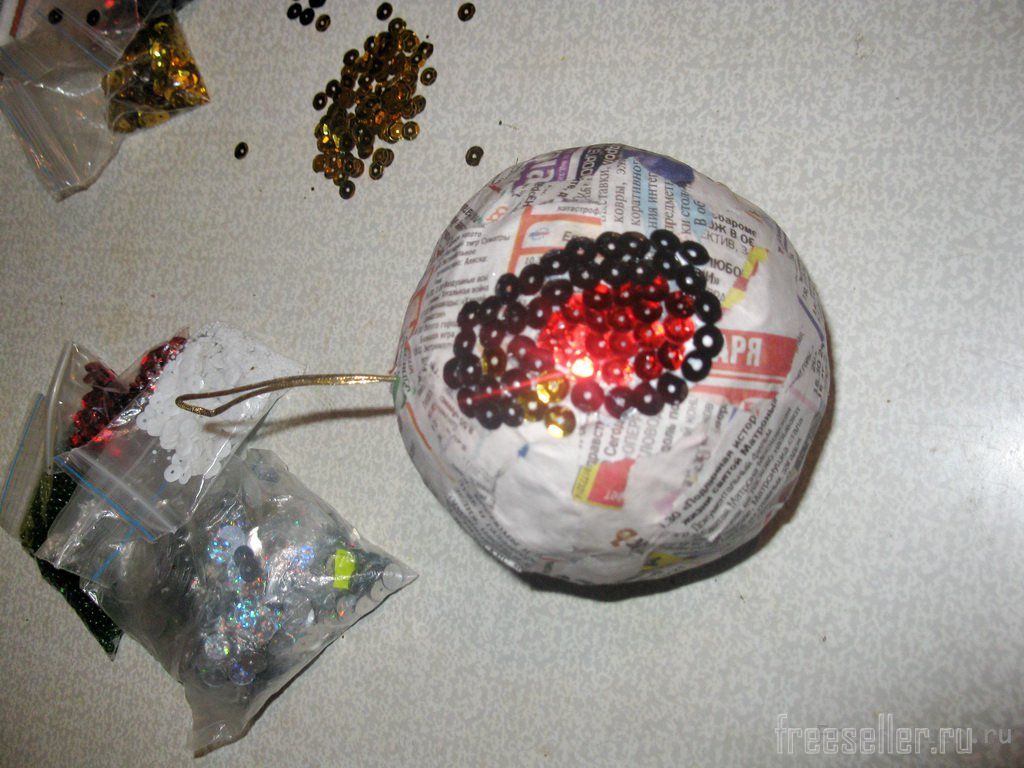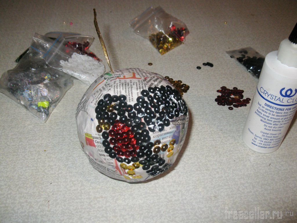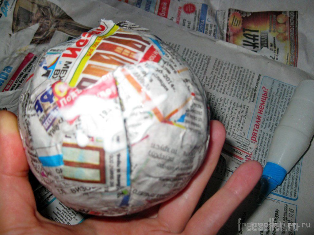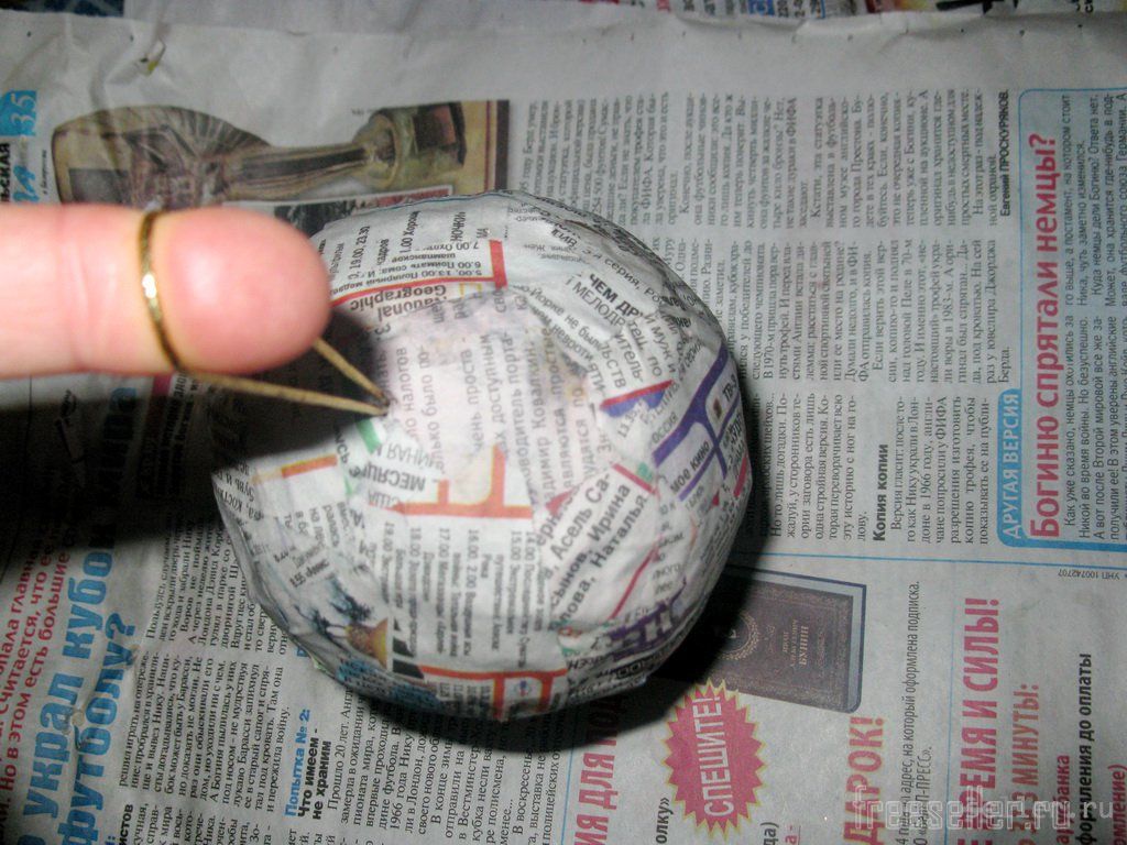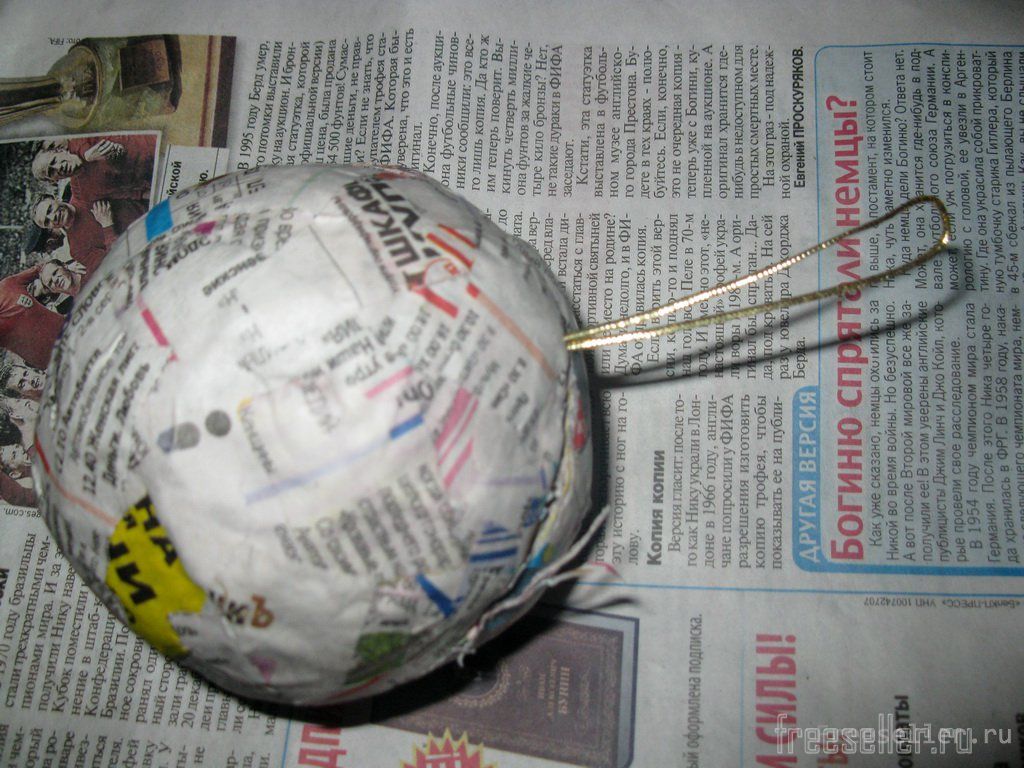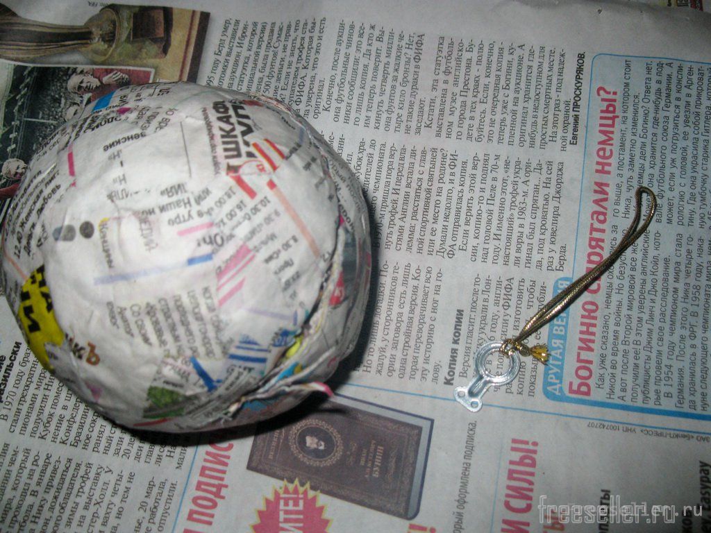 6) вставляем петлю в шарик, соединяем половинки и обклеиваем шов газетой с помощью клея ПВА (для большей надежности);