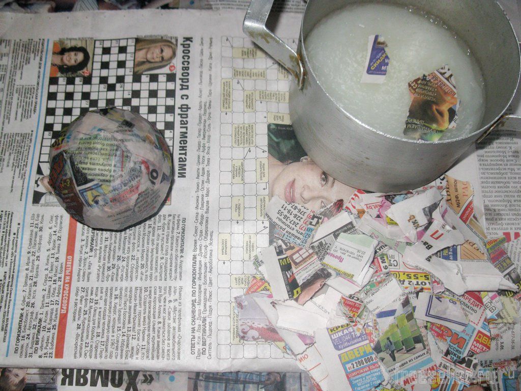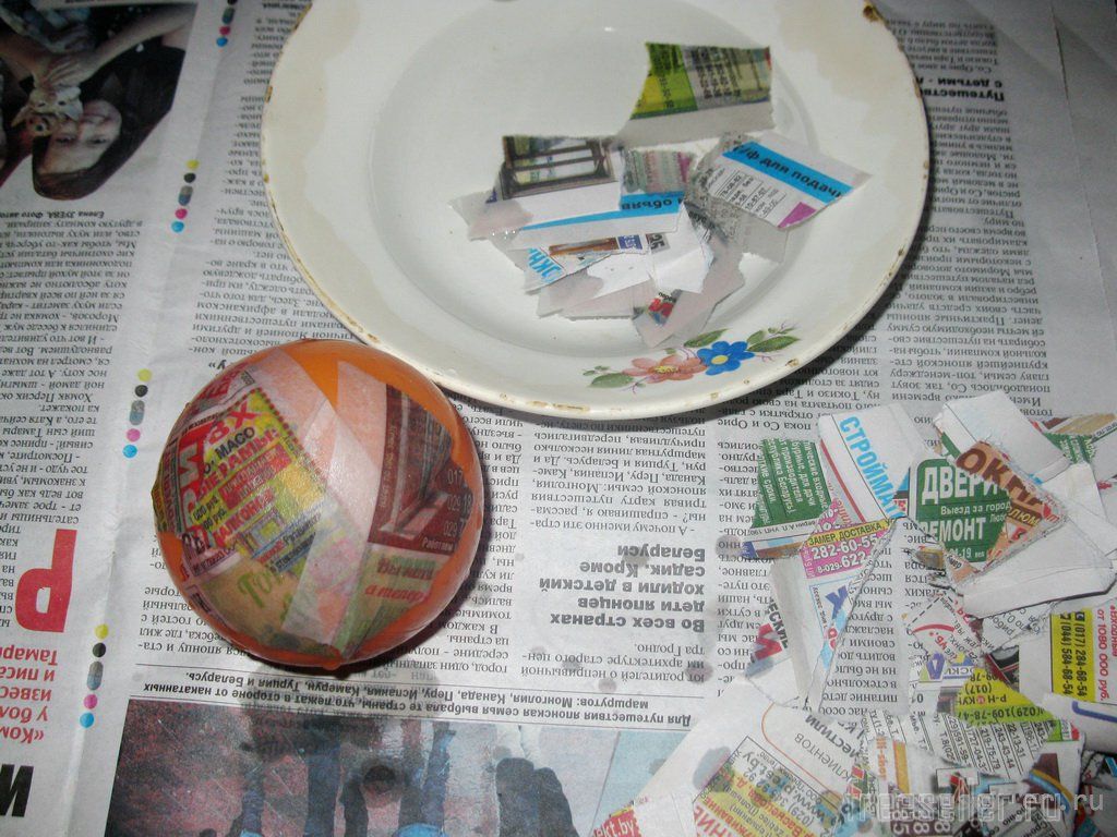 1) рвем газеты на маленькие клочки, опускаем в тарелку с водой и начинаем обклеивать ими мячик (2-3 слоя)- это нужно, чтобы заготовка потом легко отделилась от мяча;