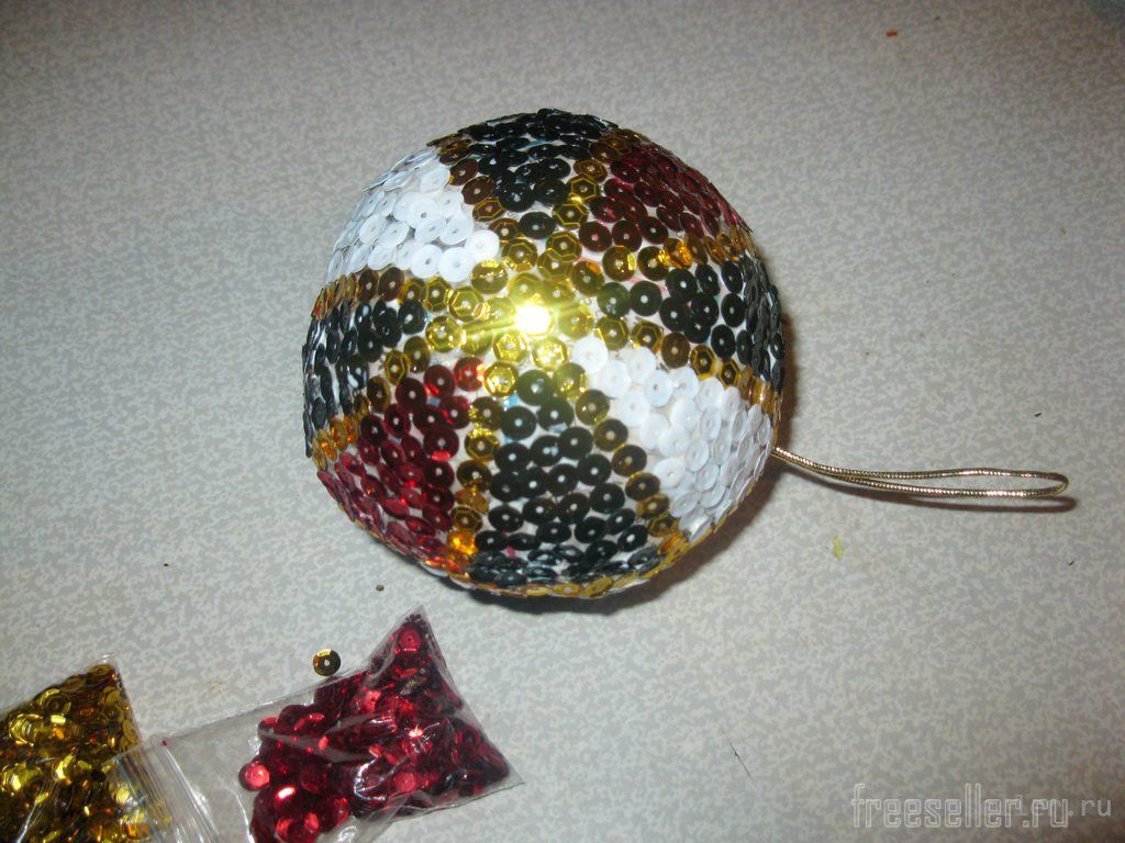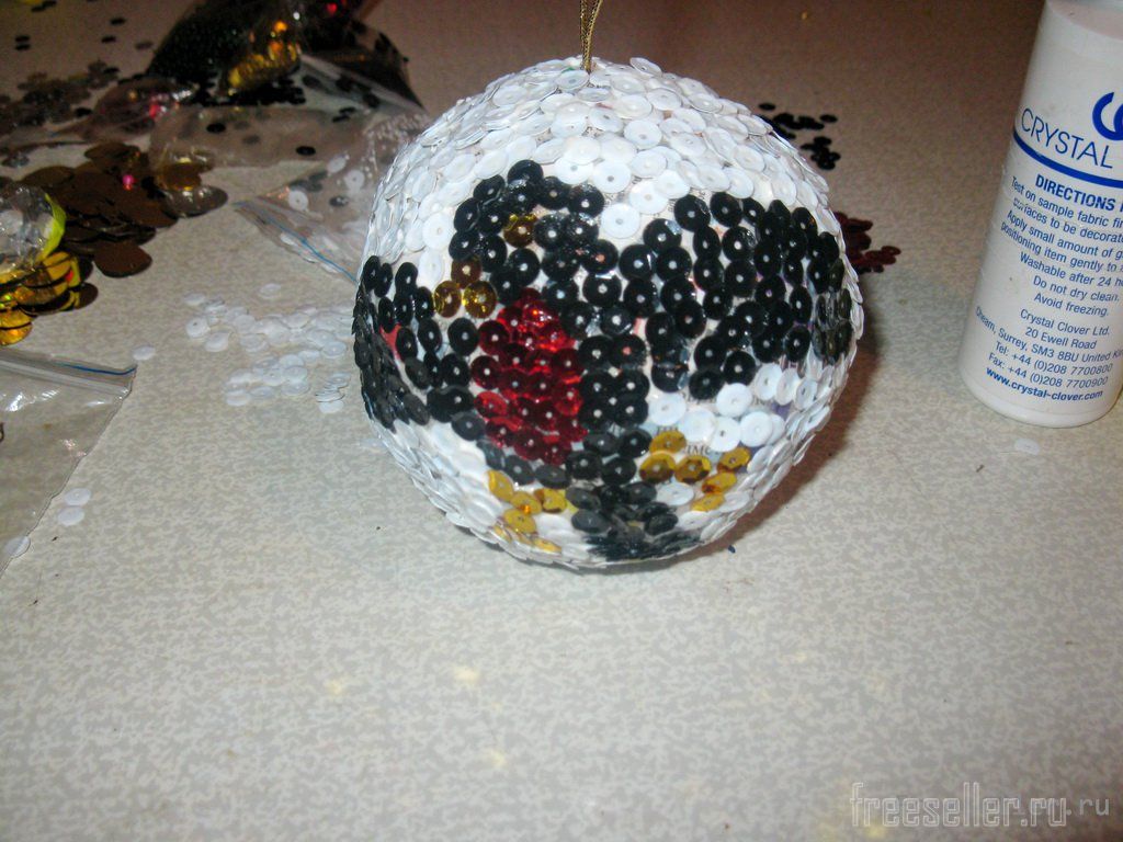 7) даем обсохнуть, придумываем рисунок для елочной игрушки: с 1 стороны - птичка-снегирь, со 2 - разноцветные сектора, с помощью паеток и клея для страз начинаем творить :winked: (паетки приклеиваем с помощью жгутика из пластилина с небольшим набегом друг на друга - для плотности рисунка).