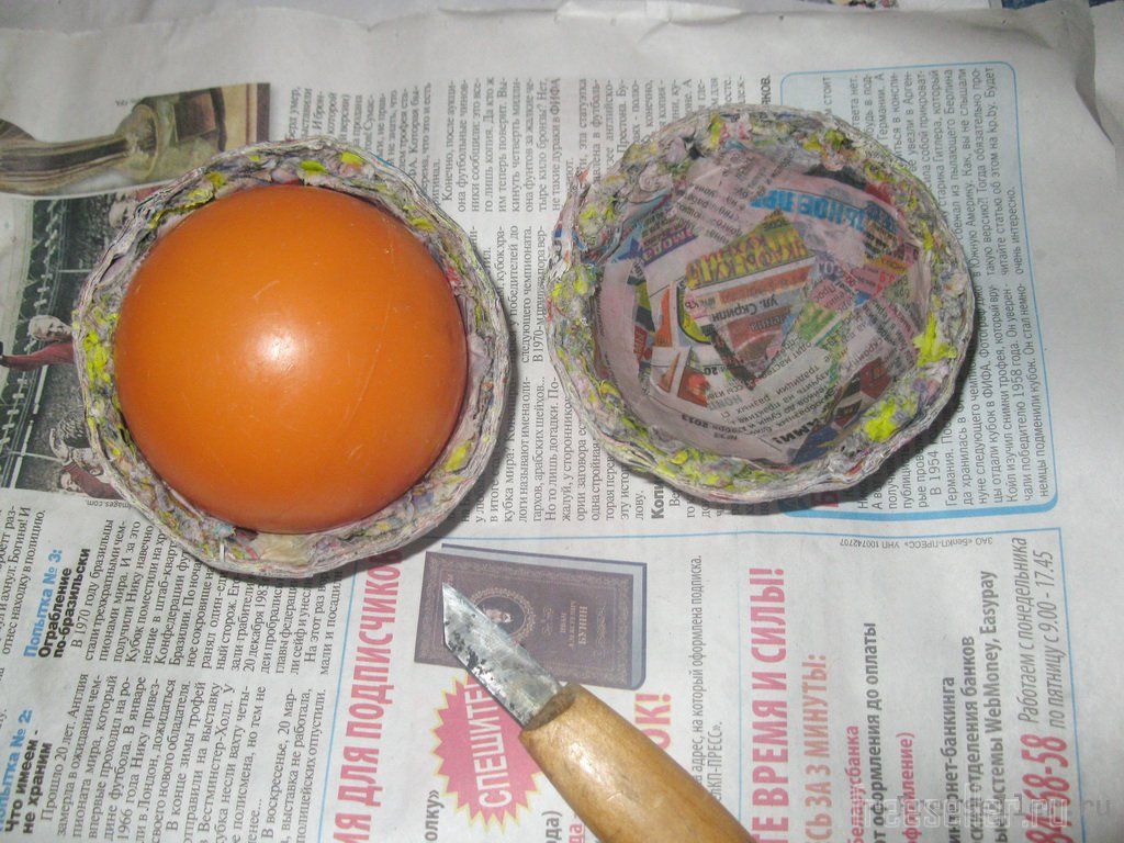 4) даем просохнуть и снова 1-2 слоя газеты, опять салфетка и несколько слоев газеты, даем мячику хорошо обсохнуть (в течение 1-2 дней) - ускорить процесс подсыхания можно при помощи фена; затем вскрываем с помощью резца заготовку;
