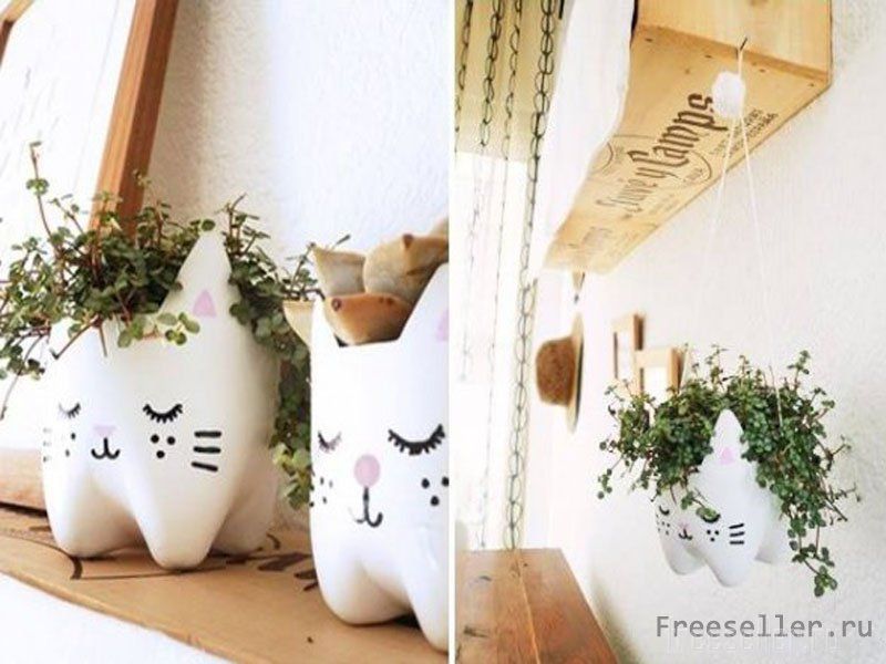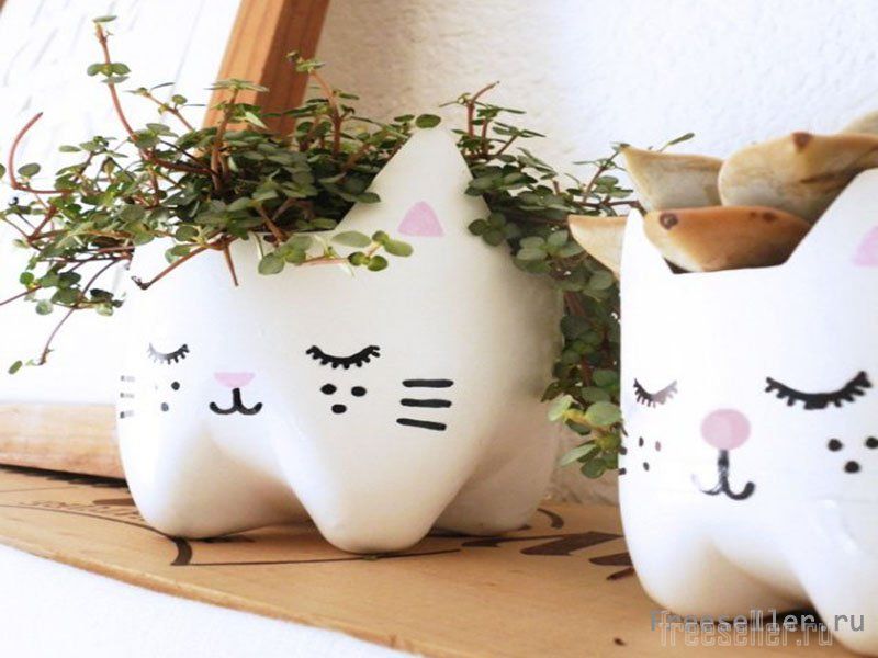 Замечательные горшочки кошечки можно сделать из ненужных пластиковых бутылок.
