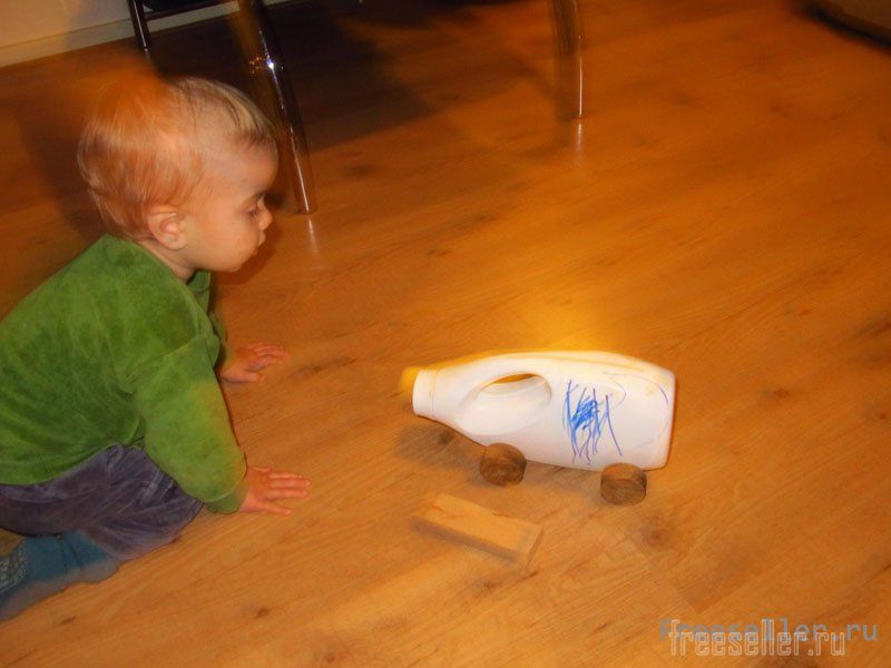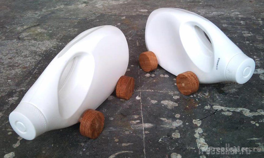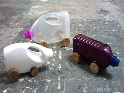 Не спешите выбрасывать пластиковые бутылки от моющих средств, кондиционеров для белья из них можно сделать отличные машинки для маленьких детей.