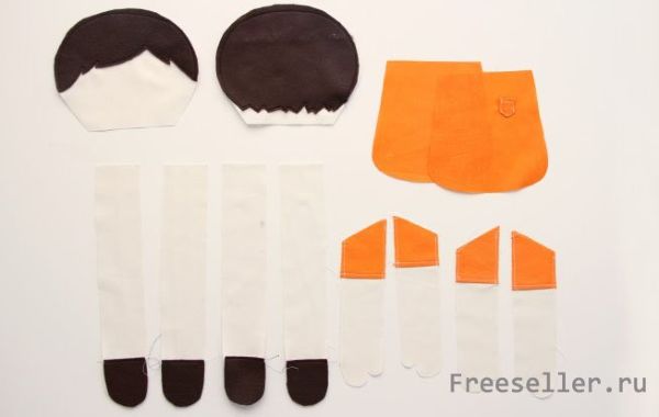 1. Выполните шаблоны на бумаге, перенесите их на ткань и вырежьте. В результате вы должны получить такие детали: голова (2 шт.), туловище-рубашка (2 шт.), ноги (4 шт.), руки (4 шт.), рукава (4 шт.), туфельки (4 шт.), глаза (2 шт.), волосы (2 разных заготовки - челка и задняя часть).