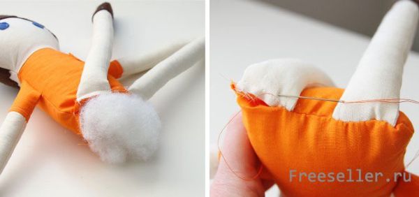 7. Пришейте ручки и ножки к туловищу. Заднюю и переднюю часть туловища также соедините между собой, оставляя отверстие внизу.