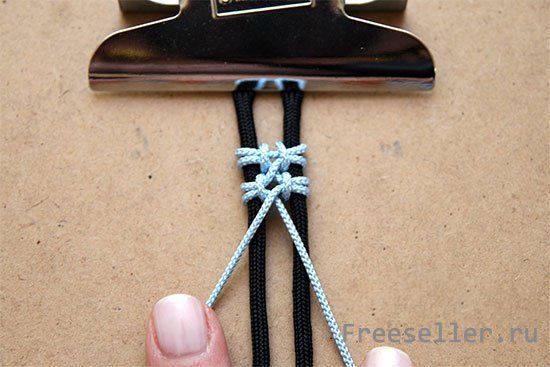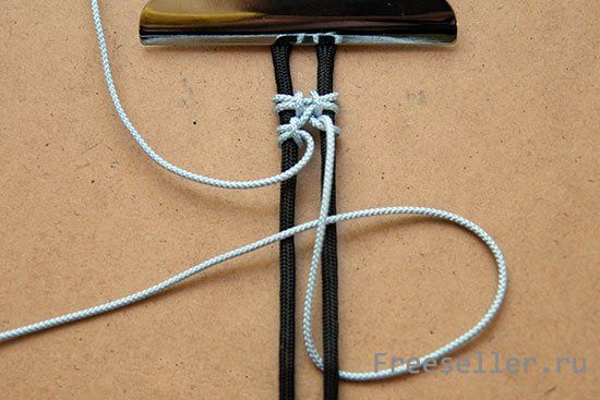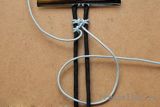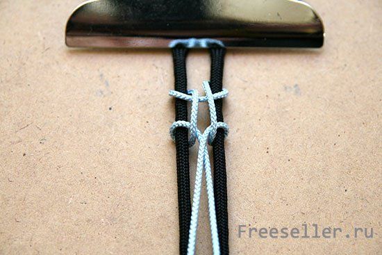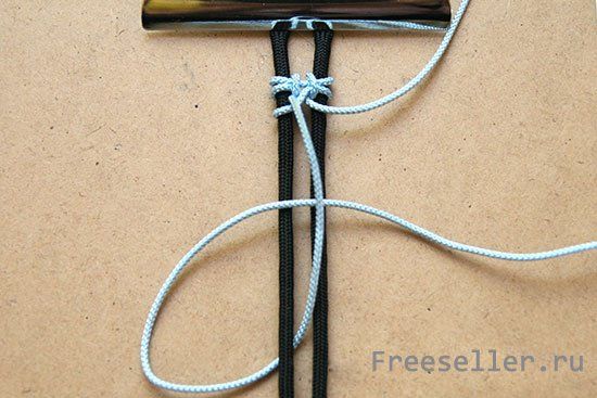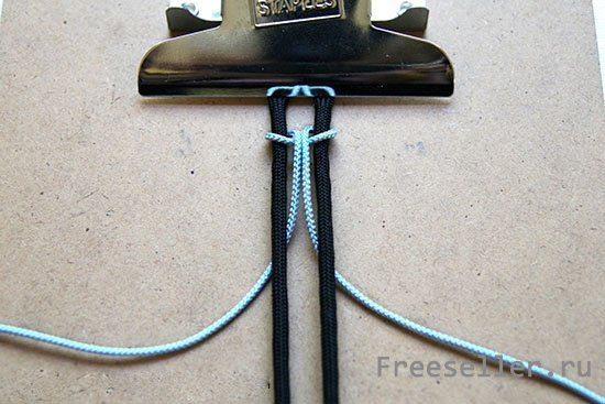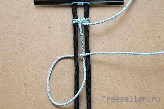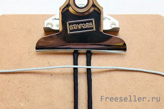 1. Закрепляем основу и обвязываем рабочую нить вокруг основы по приведенной схеме. Важно: основную нить нужно свернуть пополам,прежде чем закрепить, и оставить небольшую петлю на сгибе для будущей застежки.