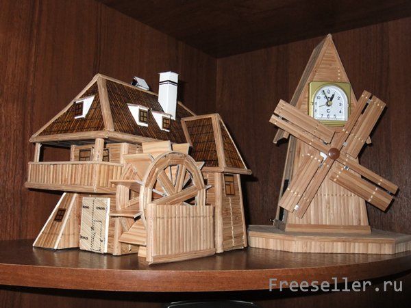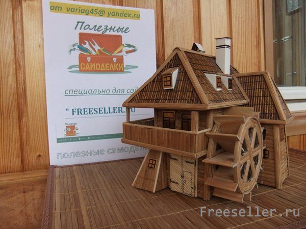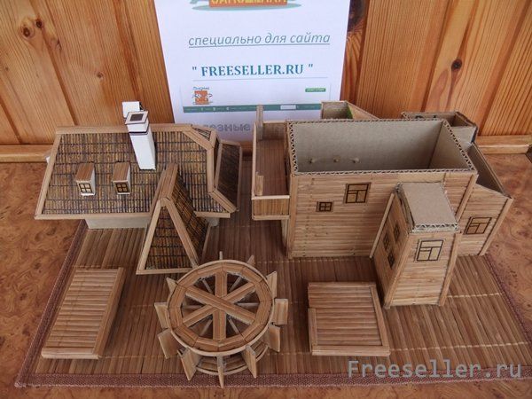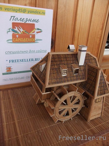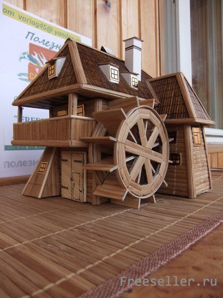 Для изготовления необходимо подобрать в интернете красивый вид водяной мельницы,или нарисовать самому из своих представлений. (Я рисовал сам). По этому рисунку составляется чертеж деталей, которые впоследствии вырезаются из картона. Любым прочным клеем (ПВА, Момент) собирается и склеивается каркас. Картон для этих целей лучше использовать гофрированный. Он хорошо клеится и создает жесткость конструкции. В стенах прорезаем отверстия для окон. Далее вся конструкция обклеивается бамбуковой соломкой (пластинками) от вьетнамских столовых салфеток, а для некоторых деталей я использовал бамбуковые зубочистки и бамбуковые шампура-палочки.