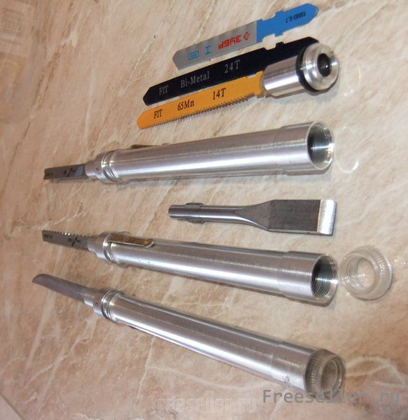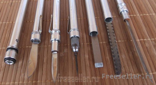 Таким образом в комплекте есть 3 разных ножа,ножовки по дереву и металлу, циркуль-измеритель, стамеска, долото, разные отвертки и метчики, фонарик светодиодный и многое другое........ Все это в "походном положении" не занимает много места и умещается в небольшом пенале. Фиксирование инструментов произведено в верхней части трубок эпоксидной смолой. Кого заинтересуют подробности - можно обращаться в личку.