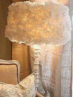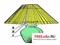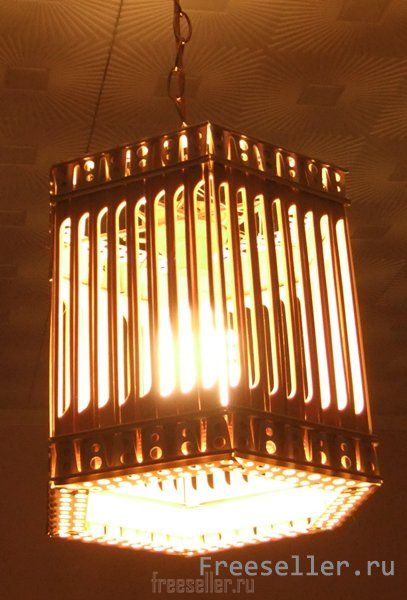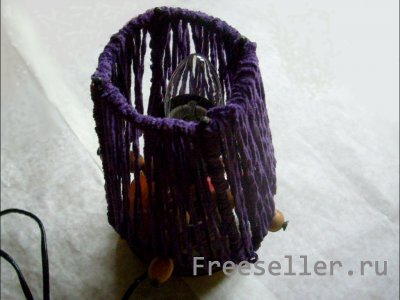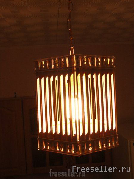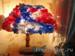 Излишки реечек осторожно обрезаются по ширине полученного полотна. Из 3 мм провода изготавливается каркас, с возможностью крепления в верхнем отверстии патрона с электролампочкой. На каркас крепятся изготовленные Вами полотна. Верхний и нижний край полотен можно украсить ажурным узором из ткани или пластика.