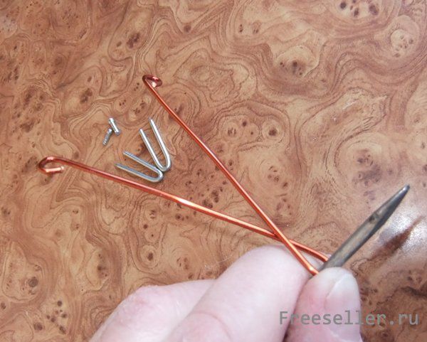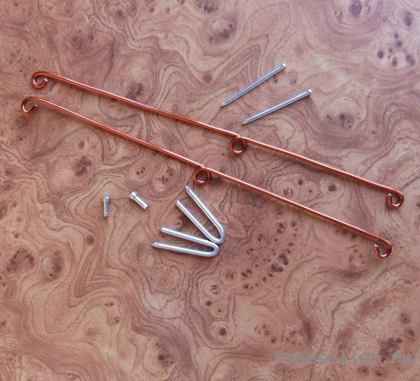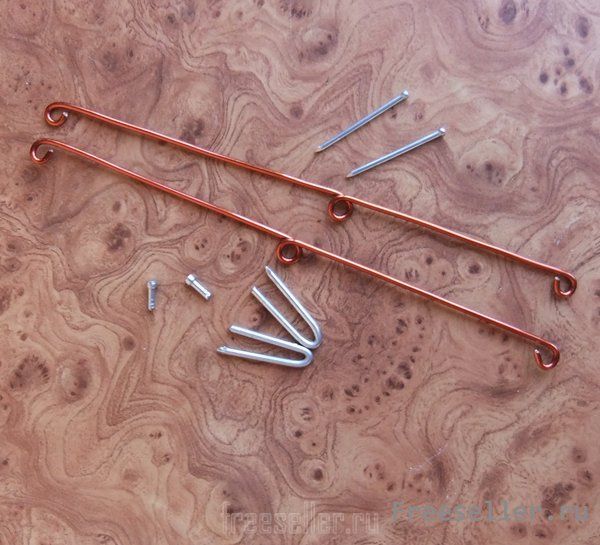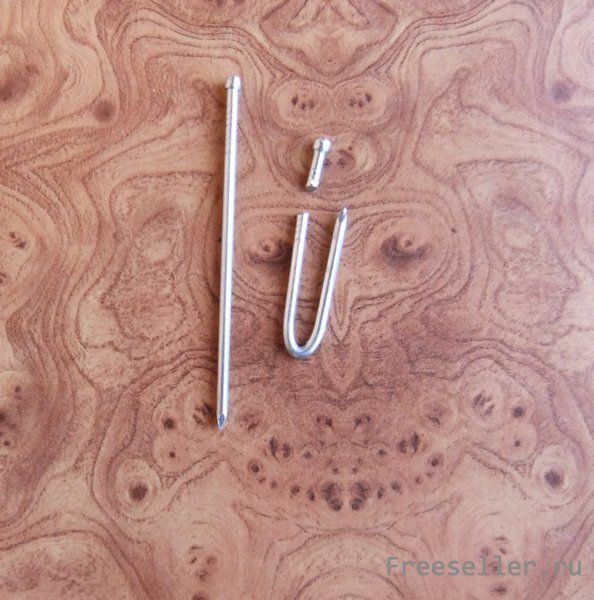 2 кусочка проволоки диаметром 2 мм, 2 маленьких гвоздика и 2 гвоздика длиной 60 мм. Из последних делаем скобки, на которые будут подвешены сами ограничители.
