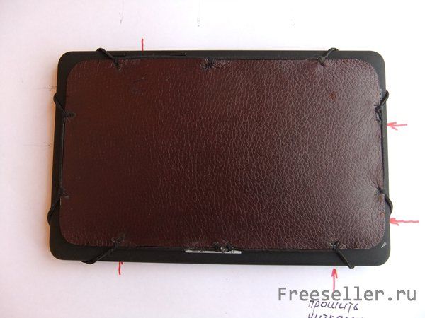 Таким вот образом крепим круглую резинку, которая будет держателем планшета, к коже (кожзаму).