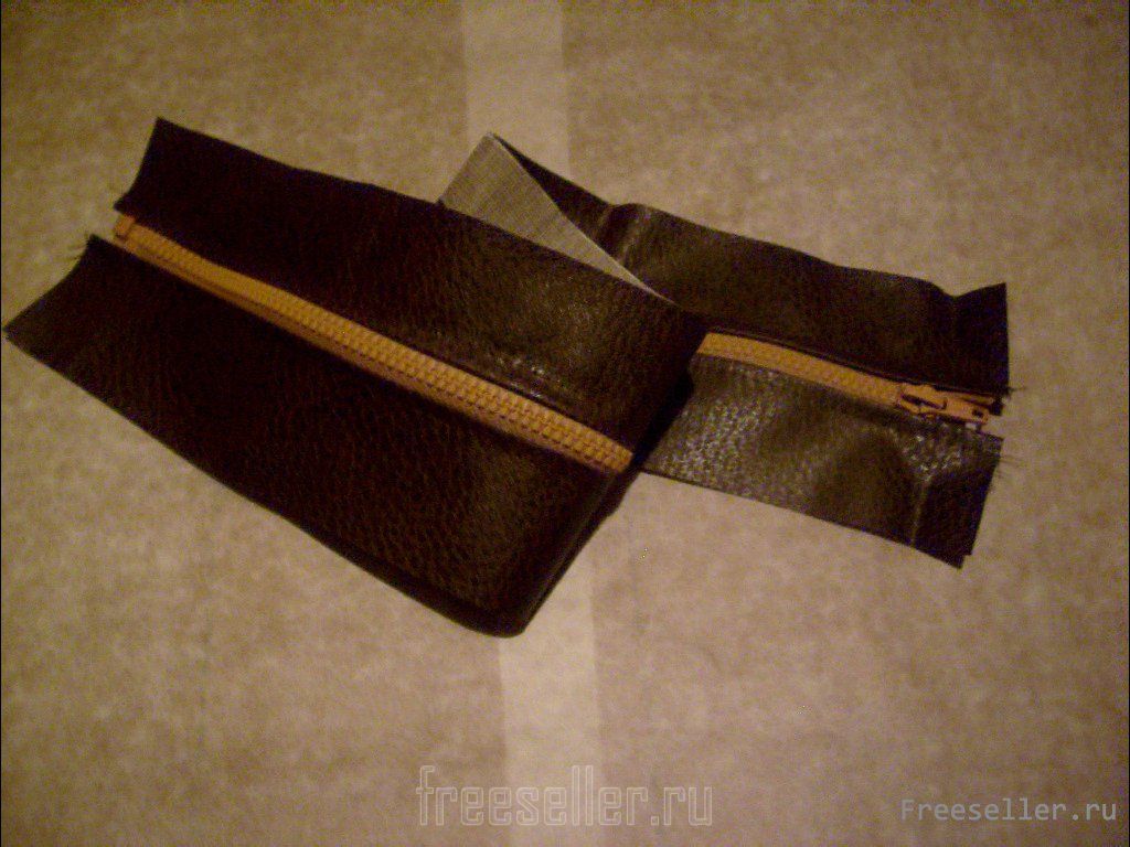 По очереди пришиваем половинки "молнии" к равным их длине полоскам дерматина. Отстрачиваем полоски близко к шву с лицевой стороны.
