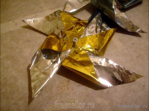 Чтобы наш ветрячок вращался на ветру, нужно прикрепить его к палочке или узкой дощечке, но не плотно. Для этого подойдут тонкие гвоздики или шурупы.