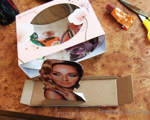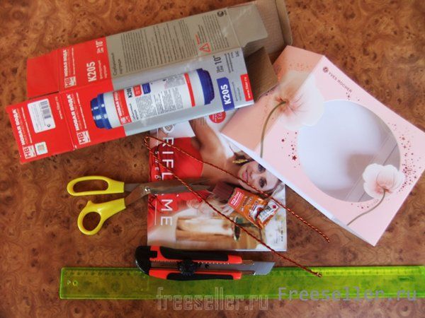 Вот из этого исходного материала мы и будем делать объемную фоторамку. Две упаковочные коробки (одна с прозрачным окном, затянутым целлофаном) и вместо фотографий я взял рекламку из журнала.
