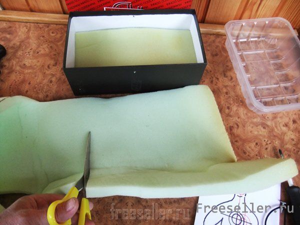 Нарезаем поролон, укладываем в обувную коробку, чередуя слой поролона со слоем ткани до полного заполнения объема коробки.