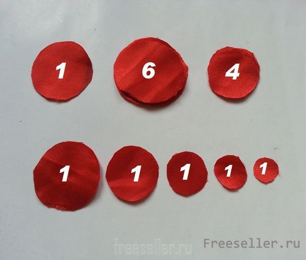 Из атласной ленты вырезаем кружочки: 1 - для основы, 6 - одинаковых для первого слоя, 4 одинаковых для второго слоя и 5 разных по размеру для верхнего слоя.