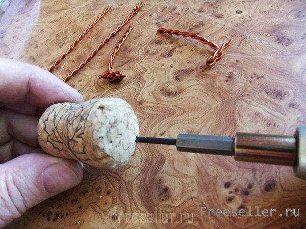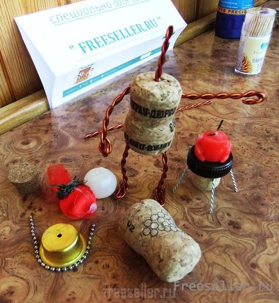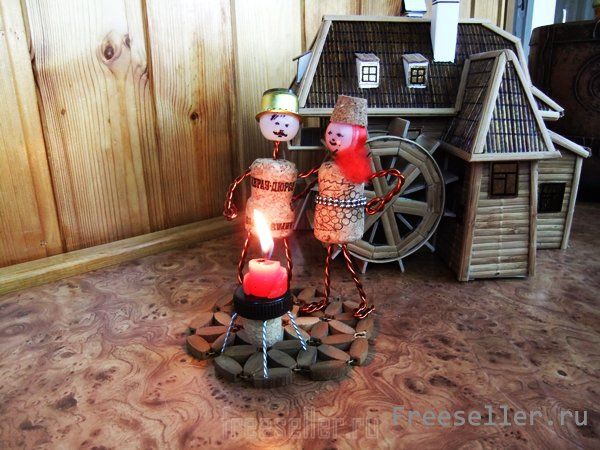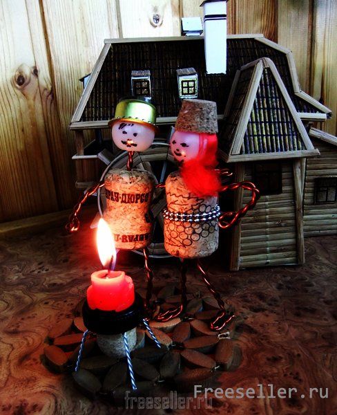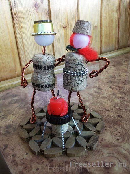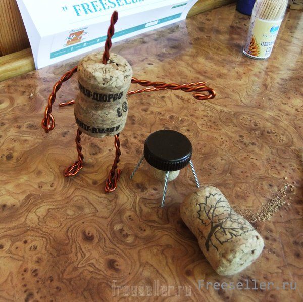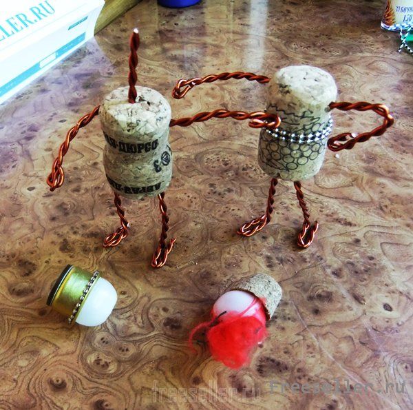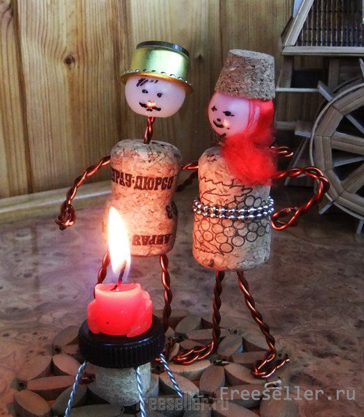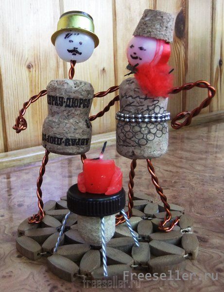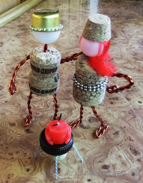 Из других пробок сделаем влюбленную семейную пару. В пробках сверлим отверстия для рук, ног и головы.