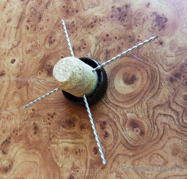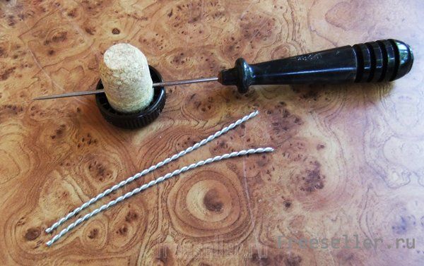 Исходными материалами для нас послужит 3 винных пробки, кусочки проволоки, огарок свечи, кусочки шариковой цепочки, два пластмассовых шарика.
