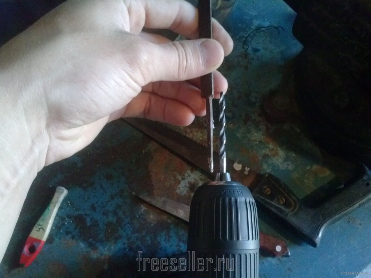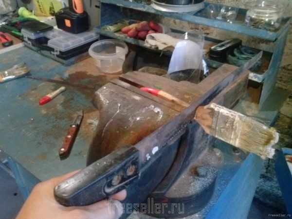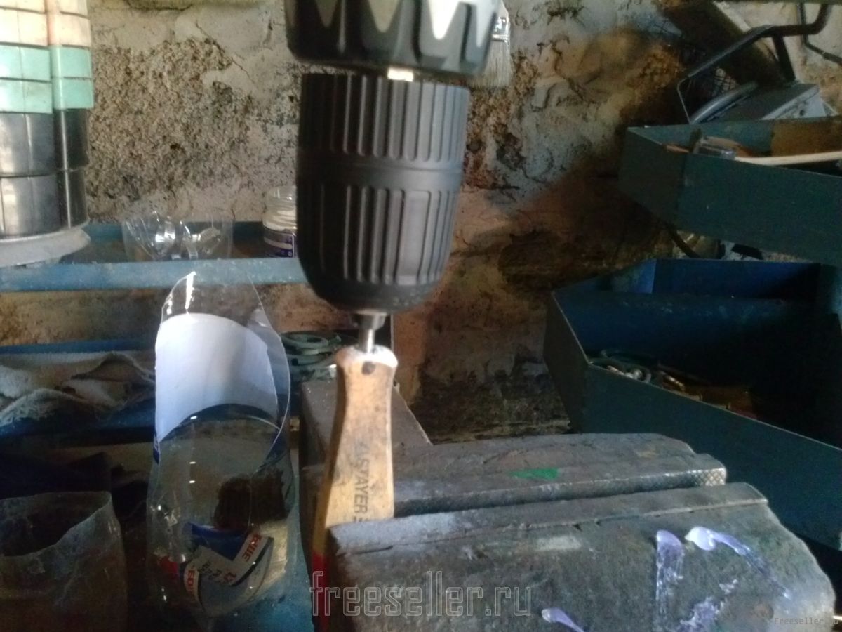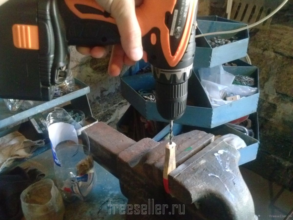 Затем зажимаем ручку от кисточки в тесках и просверливаем в серединке отверстие.