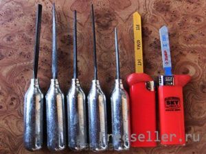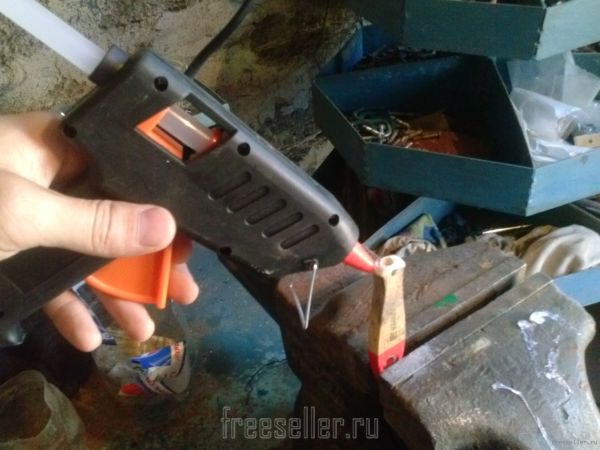 Затем термо-пистолетом (или обычным клеем) заполняем отверстие и сразу вставляем напильник.