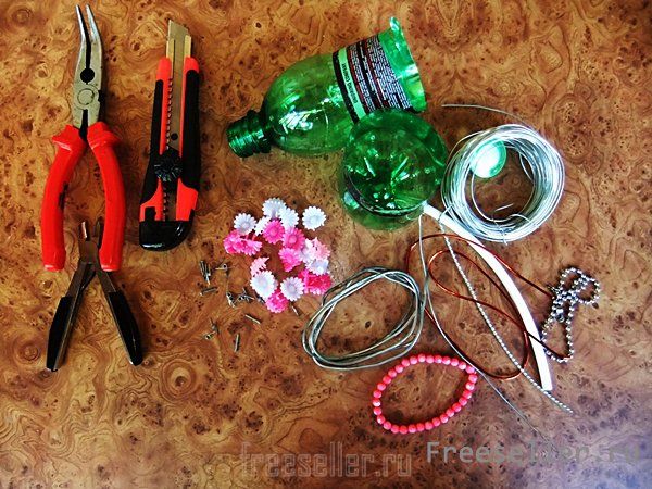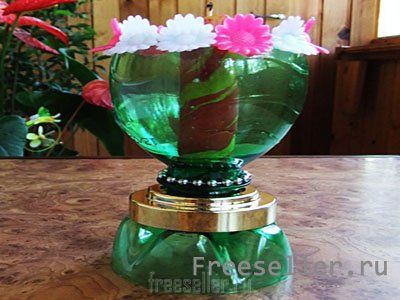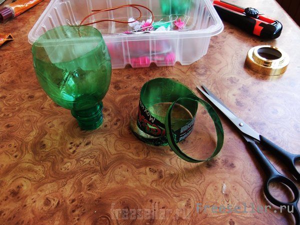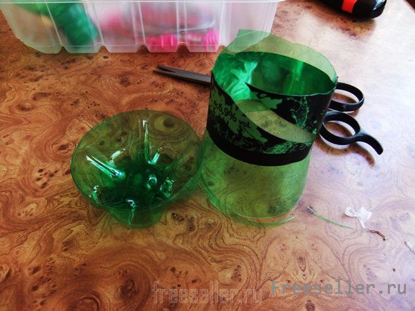 Бутылку разрезаем поперек и от верхней части отсекаем все лишнее.