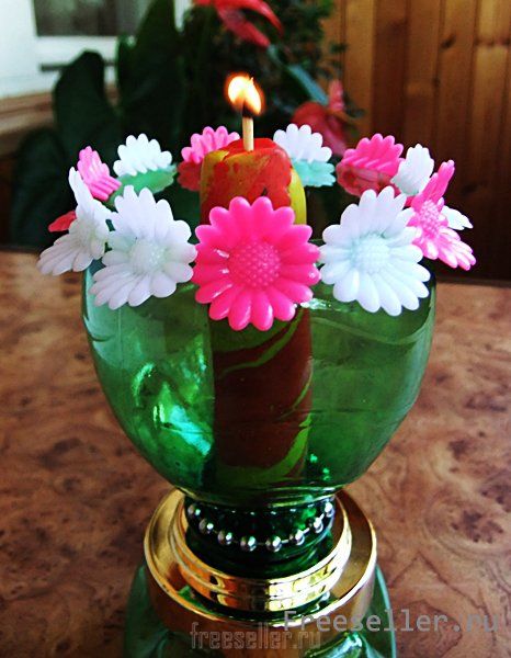 Времени и затрат никаких не составляет. Пластиковая бутылка, несколько декоративных зажимов для волос, немного клея и свеча.