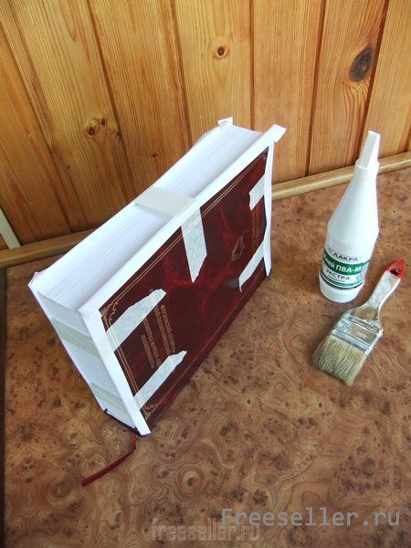 Книга по внешнему виду смотрится как солидный фолиант, только вот по содержанию, как большинство книг современных авторов, ничего ценного не представляет. Вот и пришло решение использовать эту кипу прекрасной бумаги в прекрасной же оболочке, как шкатулку для хранения ценных предметов. В моем примере - для хранения правительственных наград. Прежде чем приступить к вырезанию внутренней полости, для того, чтобы страницы не двигались - нужно зафиксировать торцы книги клеем ПВА и дать хорошо высохнуть.