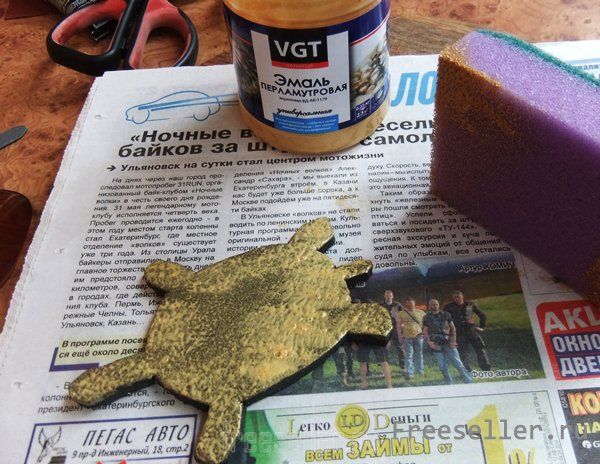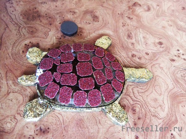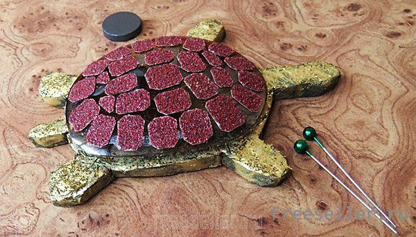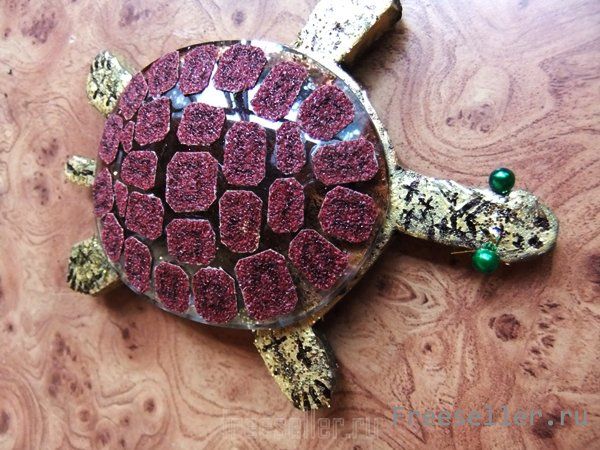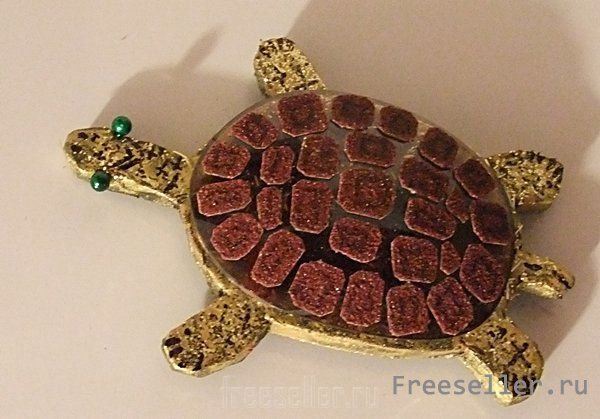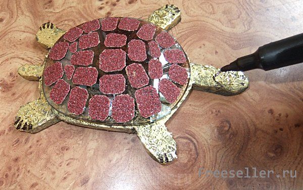 Тело черепахи покрыть перламутровой краской под золото и сверху присыпать блесками. Дать высохнуть.