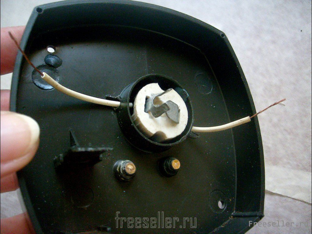 3. Разбираем керамический патрон и крепим к контактам два коротких отрезка электропровода.