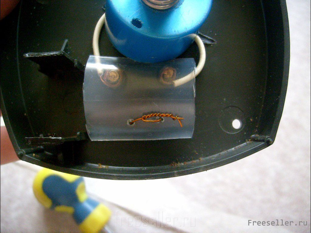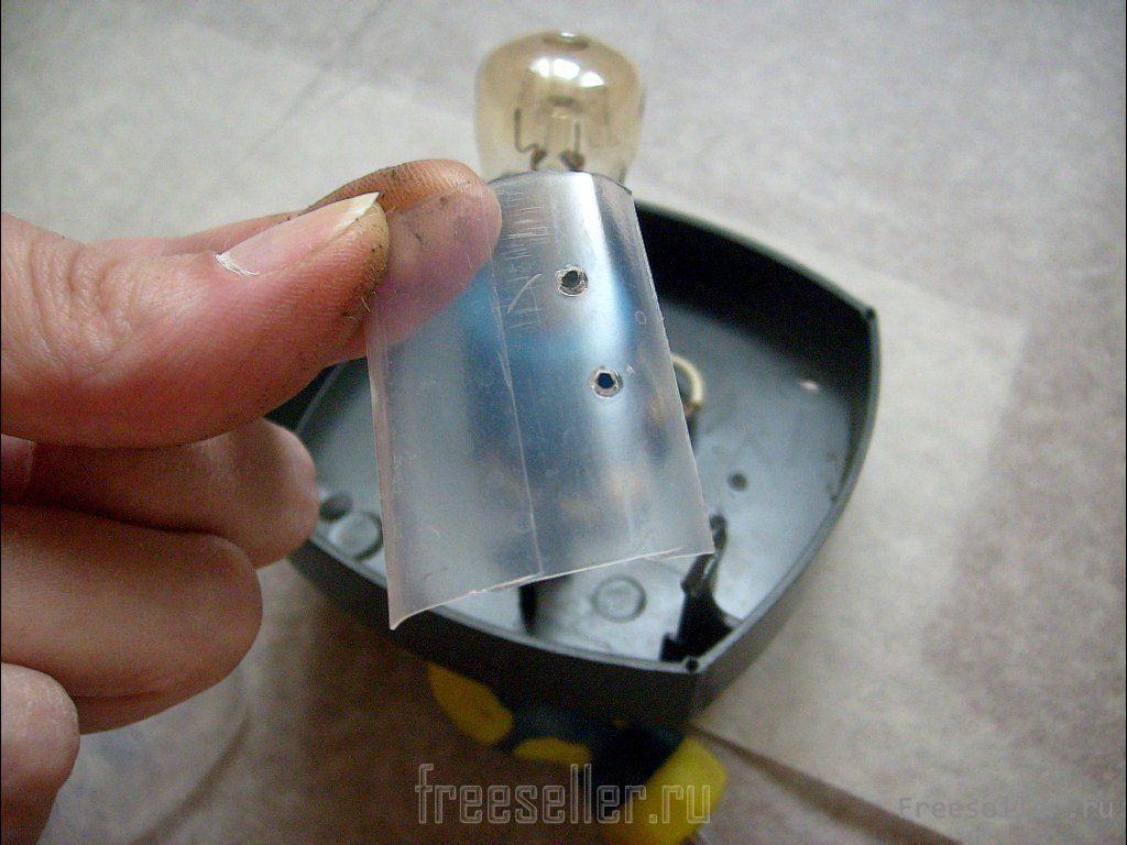 Из тонкого пластика (например, флакон из-под шампуня) вырезаем кусочек, чтобы закрыть место крепления проводов. По разметке проплавляем в нём такие же два отверстия.