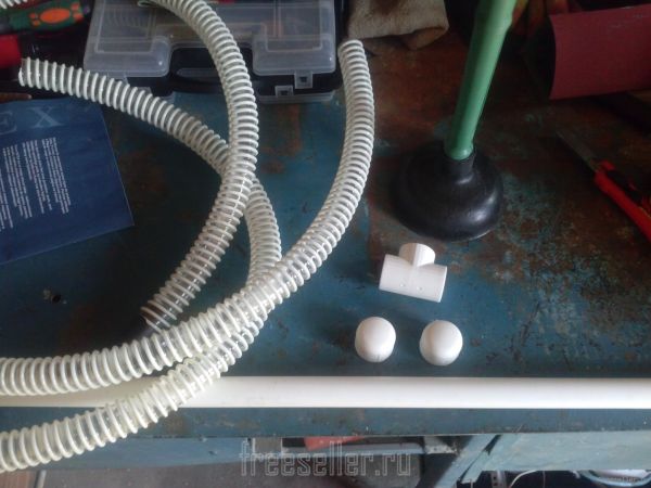 Далее берем вантуз и проделываем в его середине сквозное отверстие, вставляем трубку и одеваем на шланг.