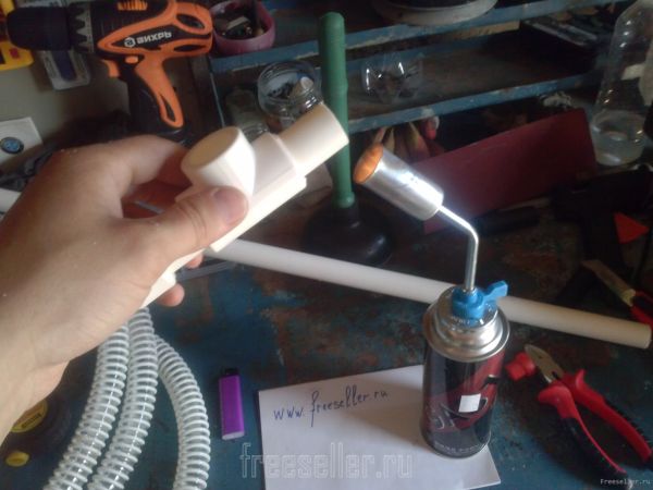 Сначала делаем тройник как на настоящем пылесосе. Для этого соединяем трубки как на фото. У меня не было паяльника, поэтому я разогревал их газовой горелкой и спаивал. Довольно прочно всё село.