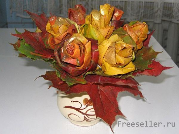 Из осенних листьев можно сделать яркий букет из роз, которые длительное время смогут радовать своими неподдельными красками.