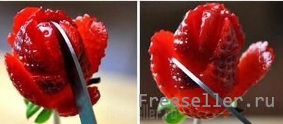 Тщательно моем ягоды, особенно в области плодоножек. Накалываем через плодоножки ягоды на трубочки и, начиная снизу, делаем надрезы в виде лепестков. Выполняем надрезы по всей ягоде.