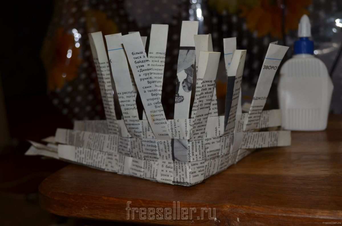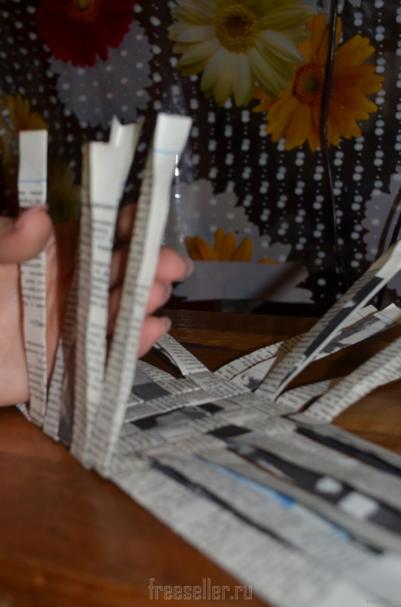 3. Для того чтоб сделать дно мне понадобилось около двенадцати полосок. Теперь плетем по примеру указанному на фото. Полоски крепим друг к другу с помощью клея.