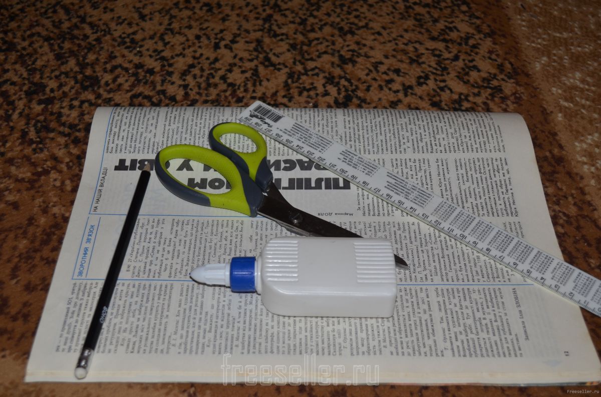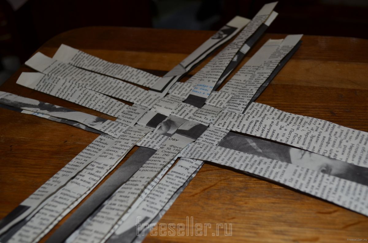 1. Берем газету или ненужный журнал и нарезаем полоски. Размеры полосок: ширина- 3 сантиметра, длина - 30 сантиметров. Однако размеры могут быть и другими, все зависит от того какой глубины вы хотите сделать подставку.