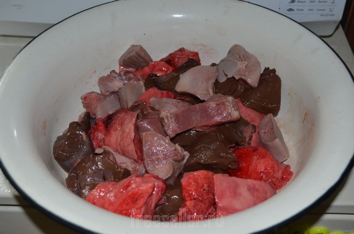 1. Готовим начинку. Берем легкие, печенку, язык и режем на ровные одинаковые кусочки. Отвариваем их. Варить нужно 1.5 часа.