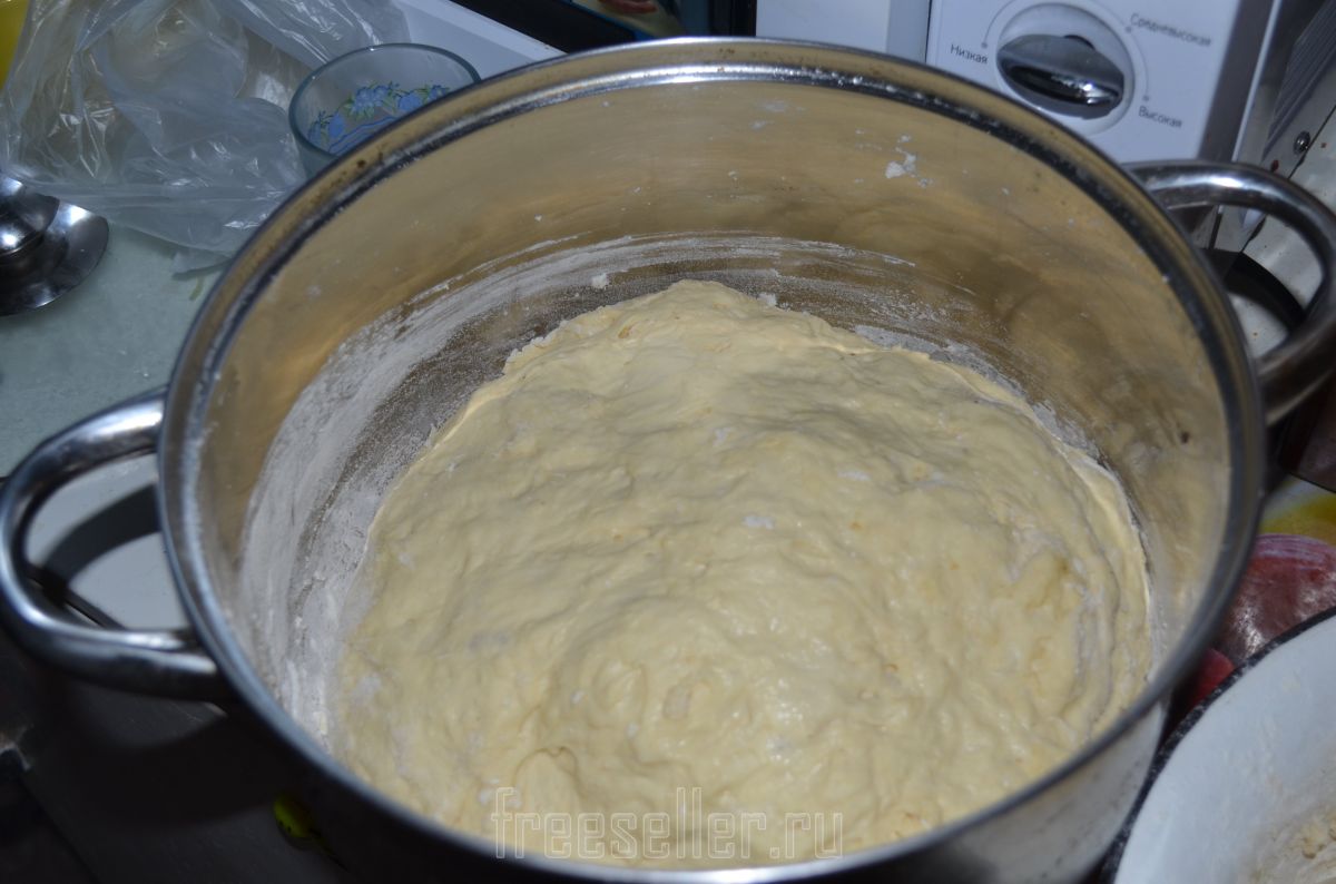 4. Замешиваем тесто. Дрожжи разводим в теплой воде, добавляем яйца, соль, 8 столовых ложек подсолнечного масла, муку на глаз. Ждем около 30 минут, тесто должно подойти.