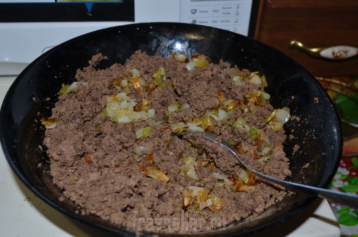 3. Вареное мясо мелим на мясорубке. Добавляем прожаренный лук, соль, перец, можно также добавить специальную приправу для мяса. Для того чтоб начинка не была сухой необходимо добавить 50 грамм масла. Начинка готова.