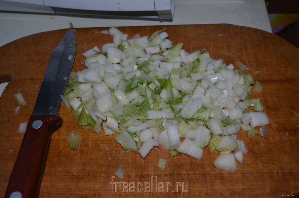 2. Берем лук и режем его на мелкие кусочки. Прожариваем на сковородке.