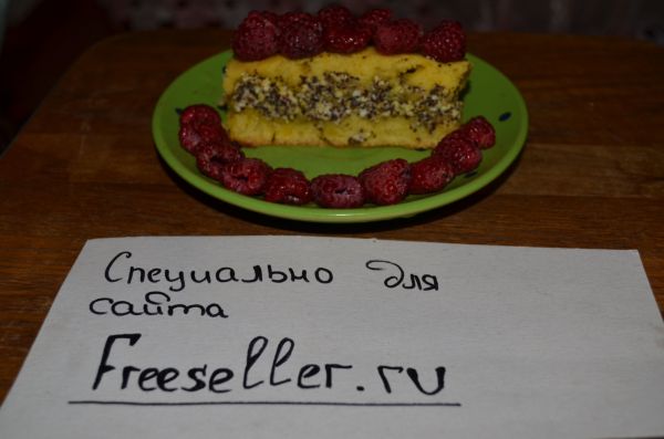 Выпекаем в духовке около тридцати минут при температуре 180 градусов. На готовность пробуем пирог зубочисткой. Когда десерт готов, нарезаем на кусочки и украшаем сверху малинкой. Наше блюдо готово!