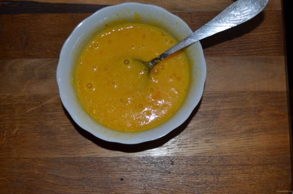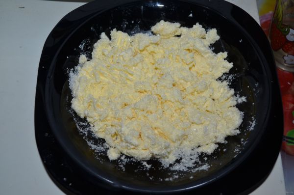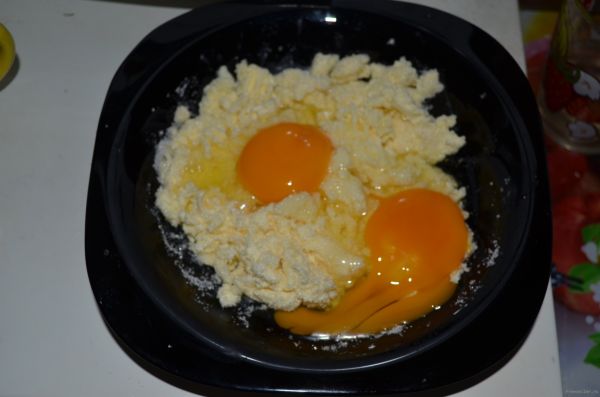 Смешиваем яйца и сахар, должна получиться однородная масса, выливаем сверху на творог.