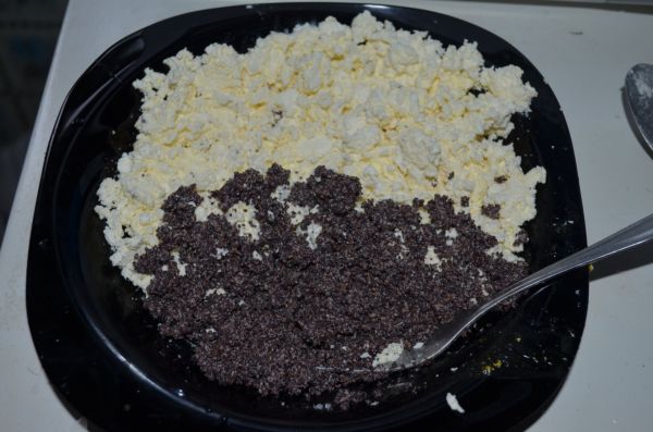 Делаем начинку. Мак на 10-15 минут запариваем в кипяченой воде, потом сливаем ее. Мак растираем, должна получиться белая пенка. Смешиваем творог с маком. Налаживаем на первый слой теста.