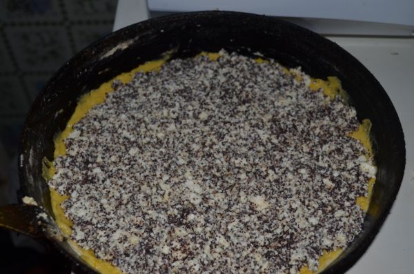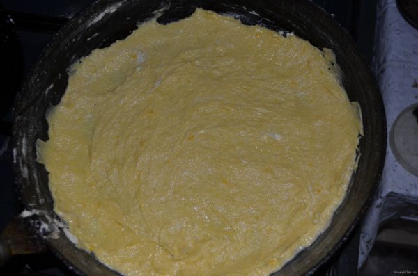 Берем сковороду и смазываем ее маслом, одну часть теста выливаем в сковороду. Вторую на некоторое время отлаживаем в сторонку.
