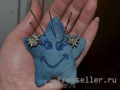 6) Украшаем нашу звездочку. Маркером или фломастером рисуем глазки и улыбку. Игольница «Звездочка» готова!!! Теперь каждая иголка будет знать свое место! Можете не волноваться по тому поводу, что швейная принадлежность затеряется в процессе работы, такой риск полностью исключен.
