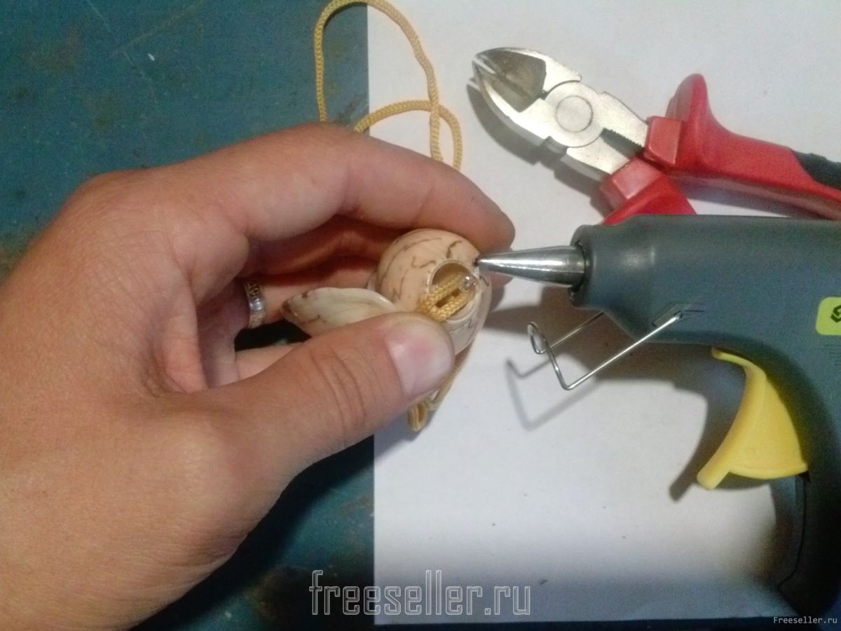 После этого, вставляем в отверстие, а ракушке веревочку и прихватываем её термо-клеем.