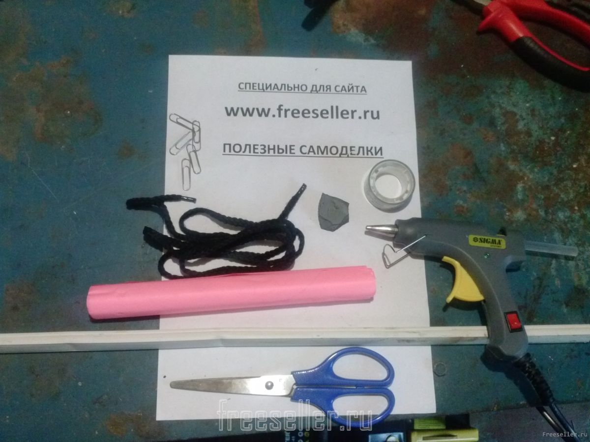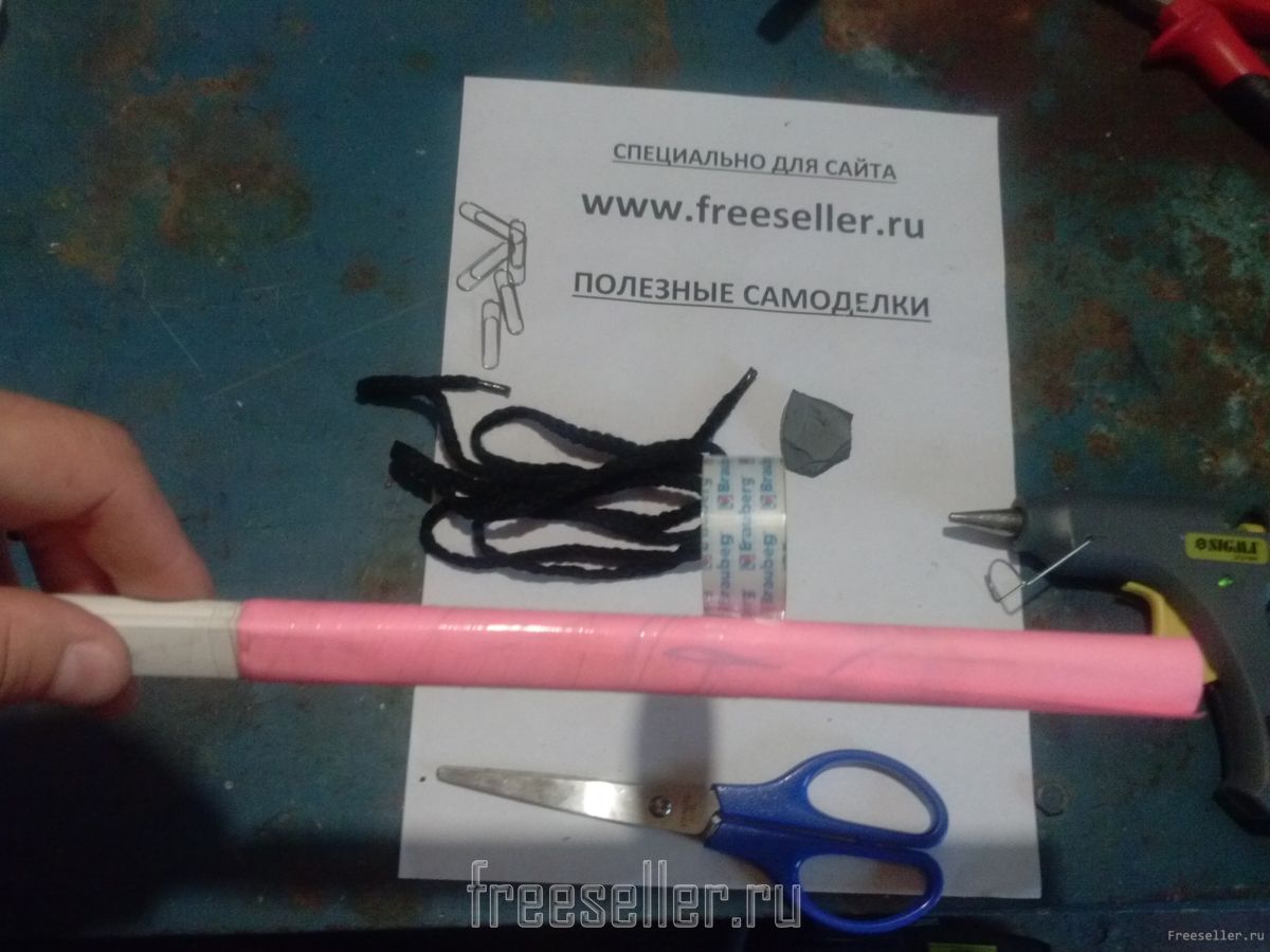 Затем на другой конец кабель канала приматываем шнурок. (так же сверху обматываем скотчем).
