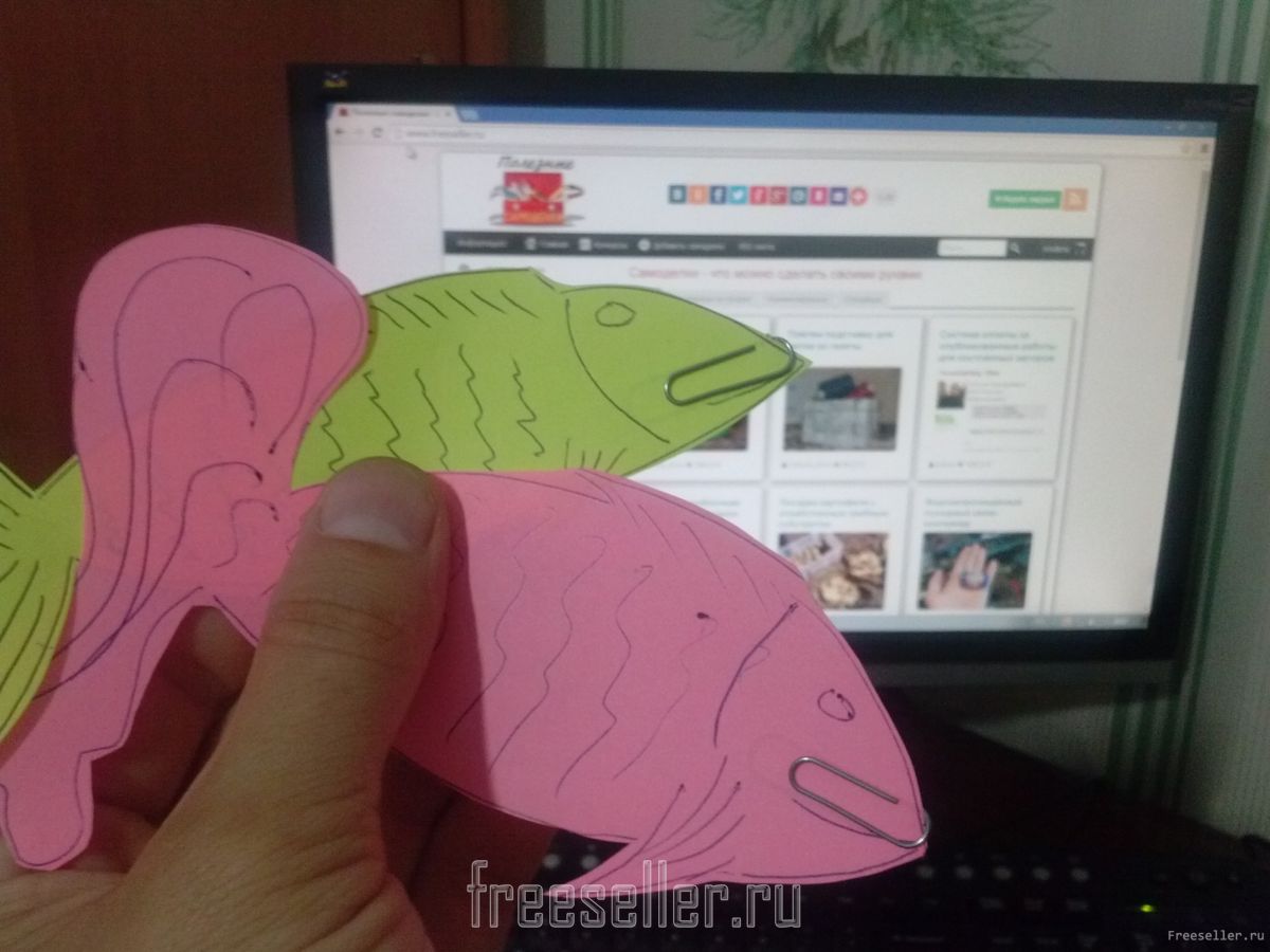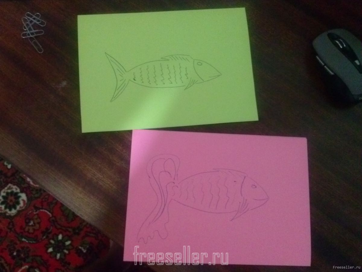 Далее берем цветную бумагу и рисуем на ней рыбок! Художник с меня не очень хороший, поэтому рыбки получились кривые :)